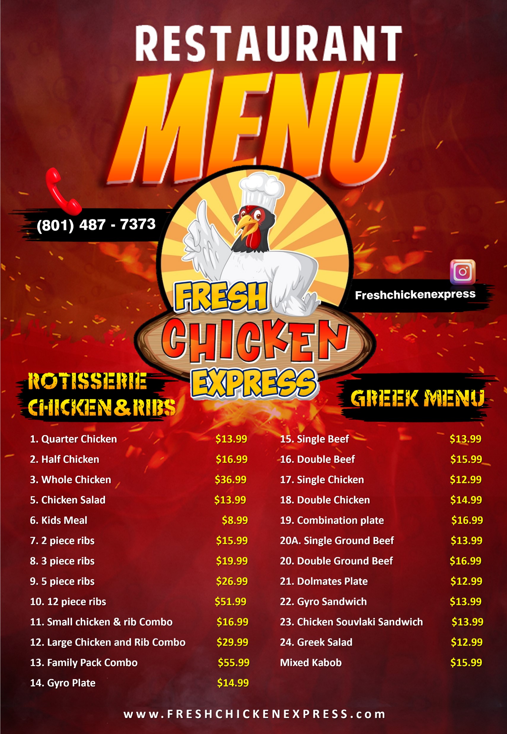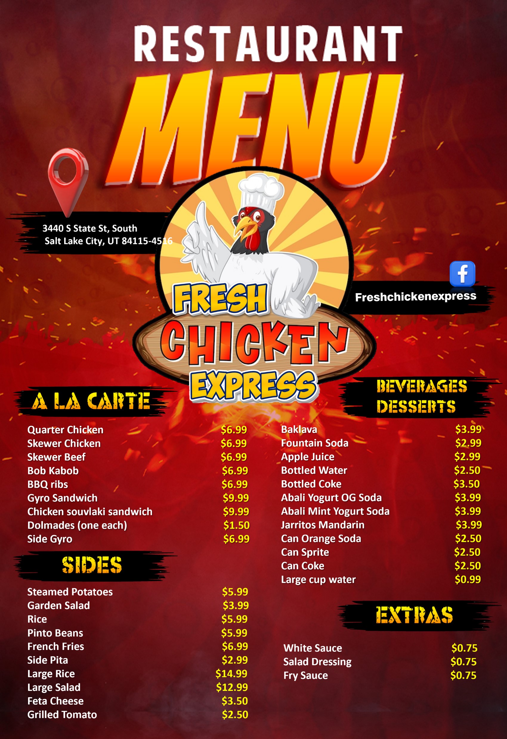 Craving bold flavors and juicy grilled goodness? Welcome to Fresh Chicken Express — where every bite sizzles! We specialize in mouthwatering grilled chicken and kebabs, marinated to perfection and flame-cooked for unbeatable taste. Our secret spices, fresh ingredients, and fast service make every visit unforgettable.